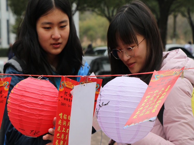 活动现场以大红色调为主,大红的灯笼和各式的灯谜整齐悬挂,处处彰显节日氛围。参加活动的同学或紧盯谜面,思索谜底,或挥洒笔墨,书写春联,或制作花灯,涂鸦绘画,通过这种方式以寄托对新的一年的期盼与祝福。
