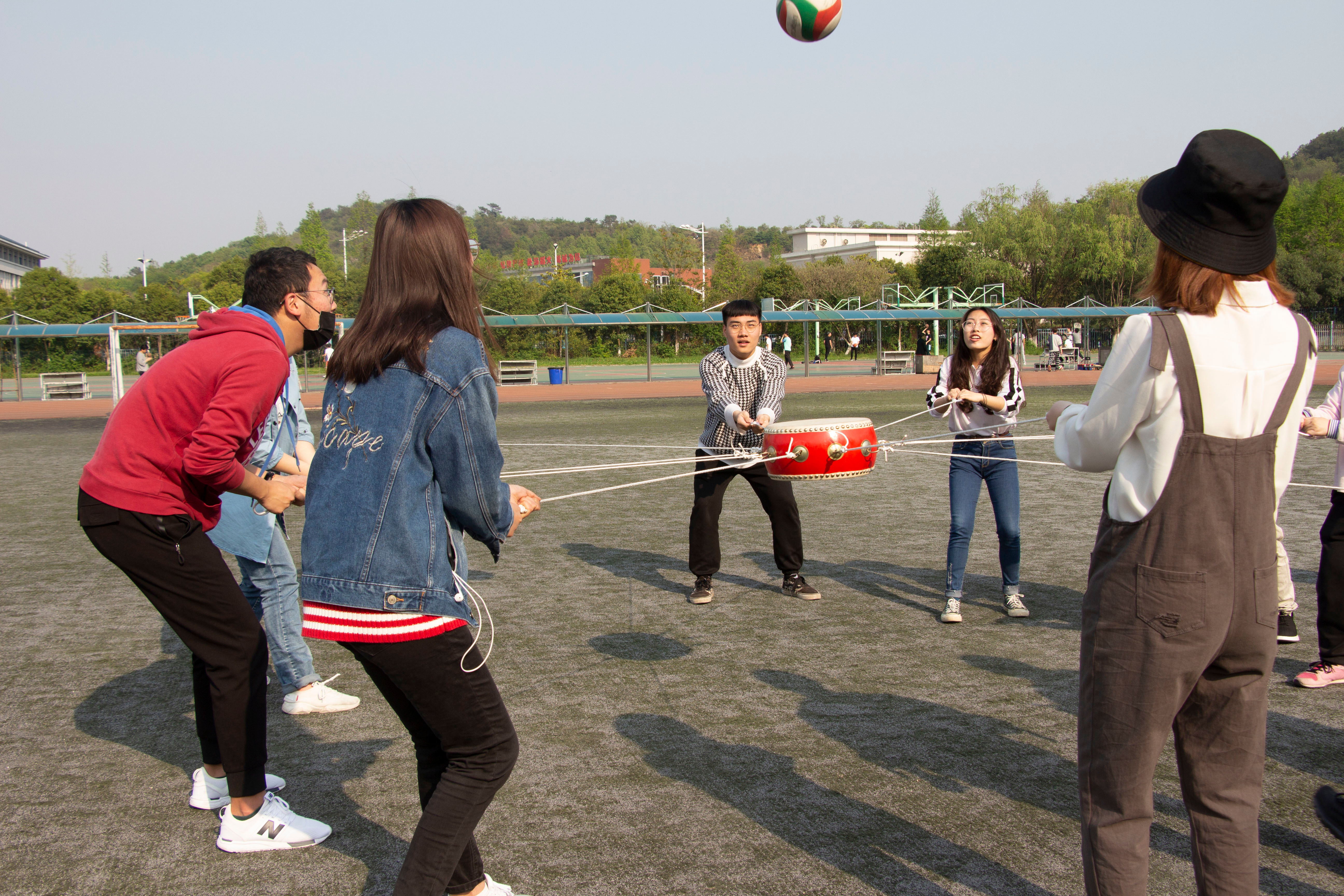 如果说“双龙戏珠”项目很考验默契度的话,那接下来的“同心鼓颠球”这个项目可谓是难上加难了。此项目要求各个参赛者围成一圈,每人手握一根绳,统一发力,让中央的鼓将球击起,击中20次用时最短的一组获胜。此项目非常考验各位选手的耐心与默契度,一不小心就会把球击飞。但是在十个人的努力配合下,20次的击球也顺利达成,这看似不可能的任务也给大家带来了莫大的乐趣。