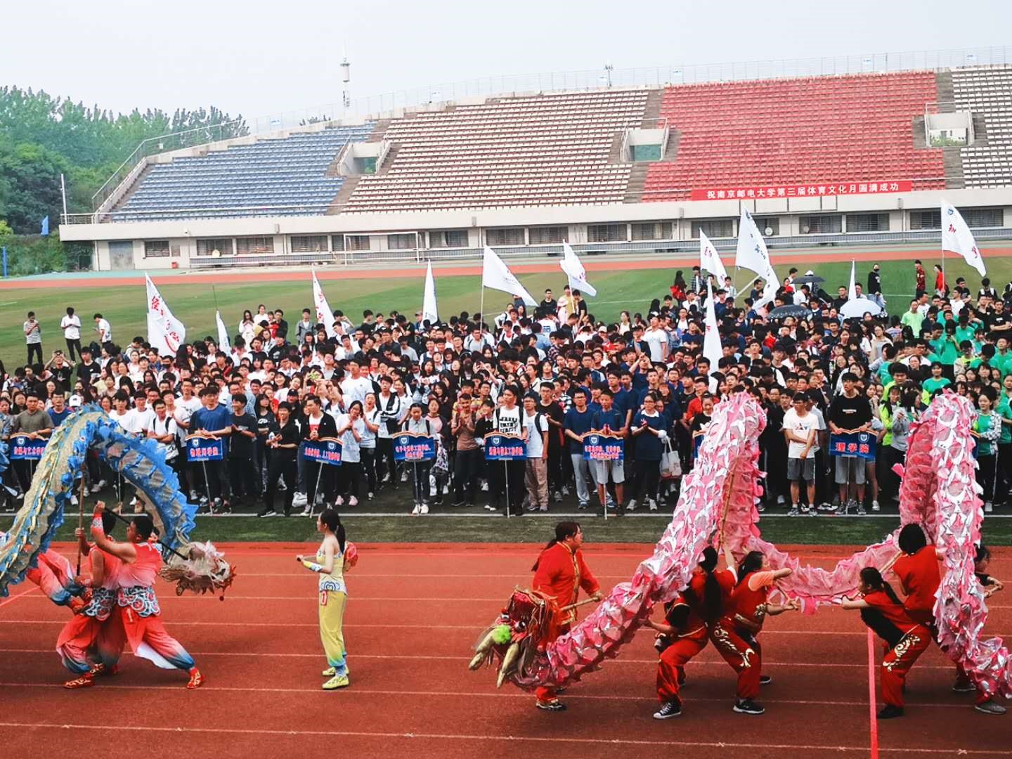 4月24日下午,第三届体育文化月开幕式暨趣味运动会在仙林校区北操场隆重举行。开幕式上,雄壮恢弘的龙狮共舞,英气勃勃的民族舞蹈,热情似火的街舞串烧,点燃了赛场氛围。开幕式后,比赛正式开始。