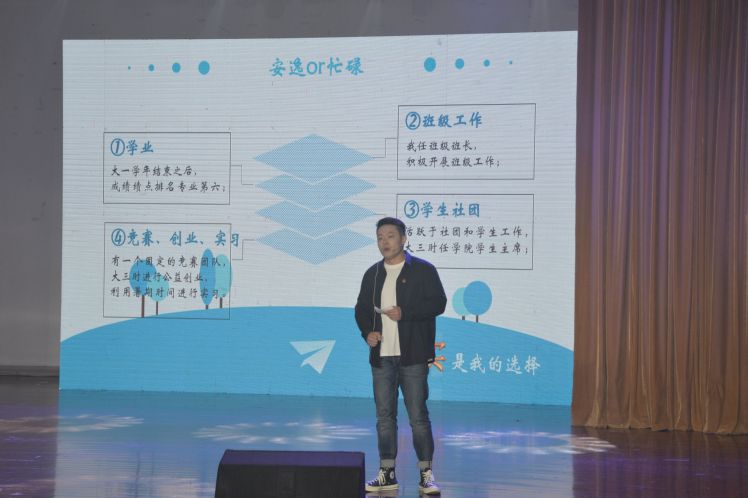 分享会采用演讲的形式进行,七位学长学姐结合自身经历,分享了自己大学期间学习、工作的经验。首先演讲的是秦艺晗学姐,学姐通过自己从走入南邮校园到保送浙江大学的点点滴滴,为大家总结了取得优异成绩的秘诀:确立大大小小的目标、养成规律的生活习惯、勇于参加各种活动及竞赛以丰富大学经历等等。之后上台的李鑫学姐参与过多次科研项目并多次获奖,以第一作者的身份发表过重要的学术论文。李鑫学姐向大家传授了大学生的科研秘笈:研究生导师十分看重大学阶段的科研经历,同时科研决定着推免申请中的能力分,多参加科学技术、创新创业方面的竞赛是丰富科研经历的主要方法。邵东隅学长从学业、班级工作、学生社团、竞赛、创业、实习等几个方面阐释了丰富大学生活的意义,学长面对如何平衡学业与社团的问题,他的回答是:要学会取舍,放弃一定休娱时间,去补足一方面的缺失。