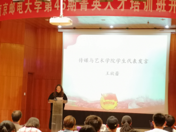 随着刘远老师的致辞结束,传媒与艺术学院朱晓萌书记上台致辞,朱晓萌书记向大家介绍了学习的重要性,重点讲解学习包括集中学习和自主学习,强调学习要与社会实践相结合。朱晓萌书记对第46期菁英人才培训班接下来的工作进行了详细的解说和安排,整个发言都体现出朱晓萌书记对大家严格的要求和美好的期望。接下来是学生代表王欣蕾发言,她提及参加菁英人才班可以促进思想觉悟的提高,完善我们的自身修养,着重强调实践的重要性,让我们作为菁英人才注重社会实践,积极参加社会实践,提高自身能力。会议以朱晓萌书记主持全体起立奏唱团歌为结束。