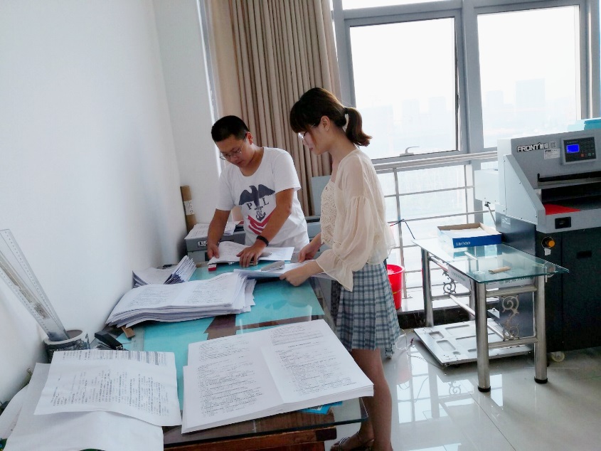 再次,问卷修改工作完成后,我们在文印室进行行问卷的印刷、装订工作。问卷总计350份,印刷完成后,由于时间已经临近下班时间,为了快速完成问卷的装订工作。所有团员都参与进来,协助文印室工作人员对问卷进行集中装订,虽然任务量量很大,但是大家都很认真、负责地完成。