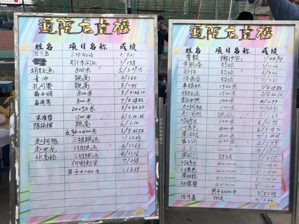 在26日、27日两天的比赛中,通院龙虎榜收获满满,这闪烁的成绩,是运动员们努力的硕果。其中,韦镇林同学和李毅同学分别在女子甲组1500米和男子甲组掷沙包项目中获得第一名的好成绩;赵珂旭同学斩获男子甲组三级跳远第一名和男子甲组跳远第三名的优异成绩,并在男子4*100米夺得第三,4*400米第一。蒋子润同学带伤上阵,夺得男子400米银牌和4*400第一,并当选优秀运动员。通院的团体项目也收获佳绩,在男子甲组4*400m和女子甲组4*400m比赛中收获两枚金牌,男子引体向上第一名,20*50米夺得第三名。