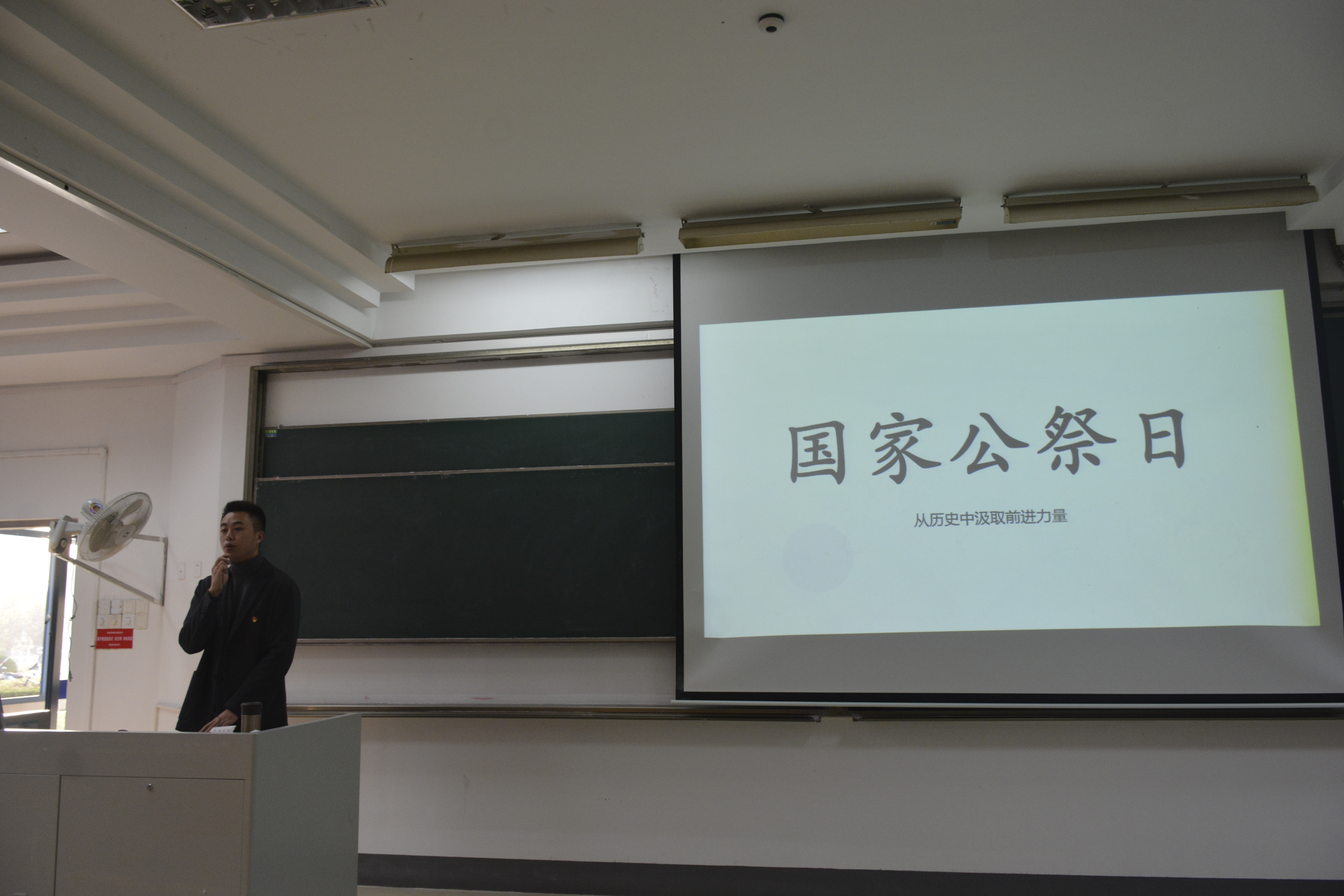 结合国家公祭日这个特殊日子,今年第六个国家公祭日,从国家公祭日的由来、现实意义出发,季老师进行了理论宣传。“在这个沉痛的日子里,作为新一代的中国青年,同学们当谨记:吾辈当自强、勿忘国耻。不是宣扬延续仇恨,而是要以史为鉴,砥砺前行”。