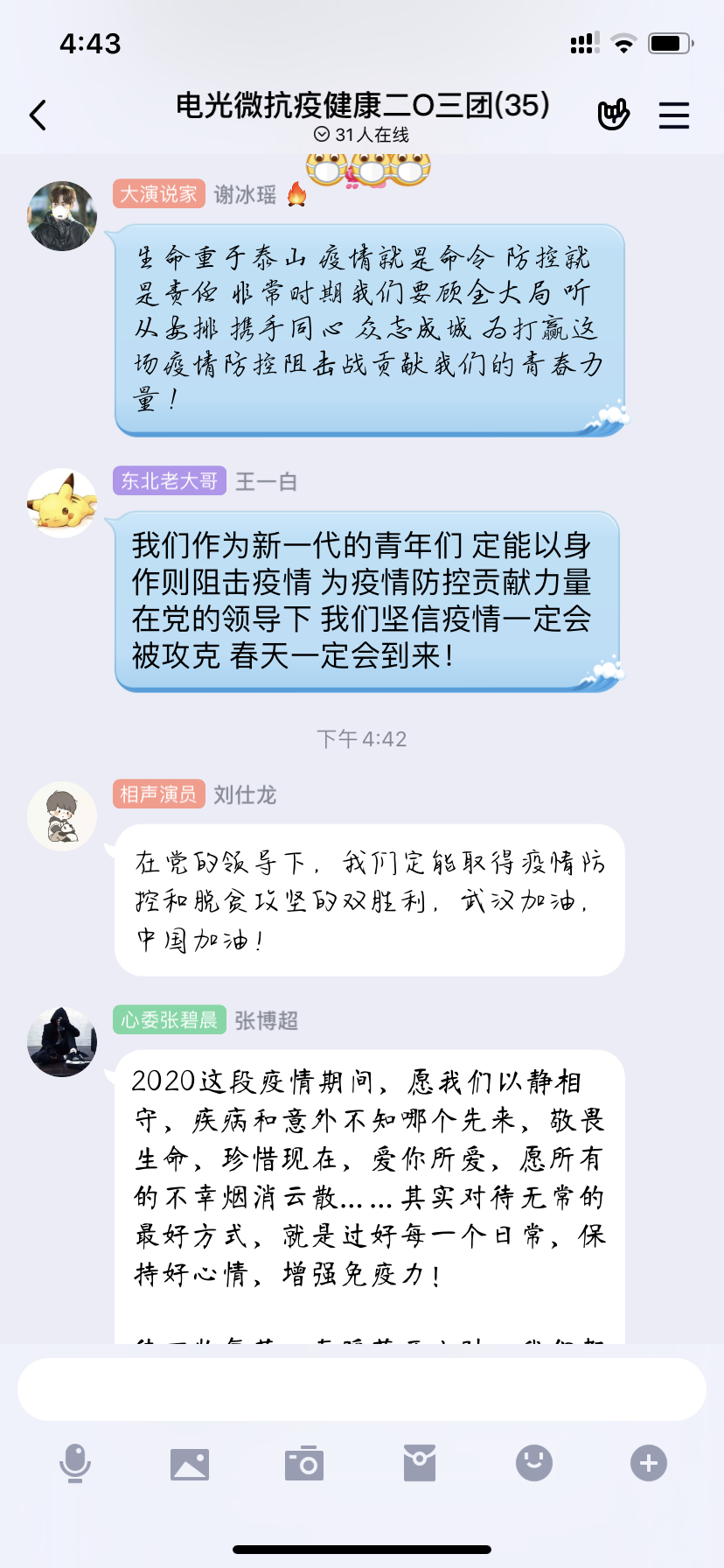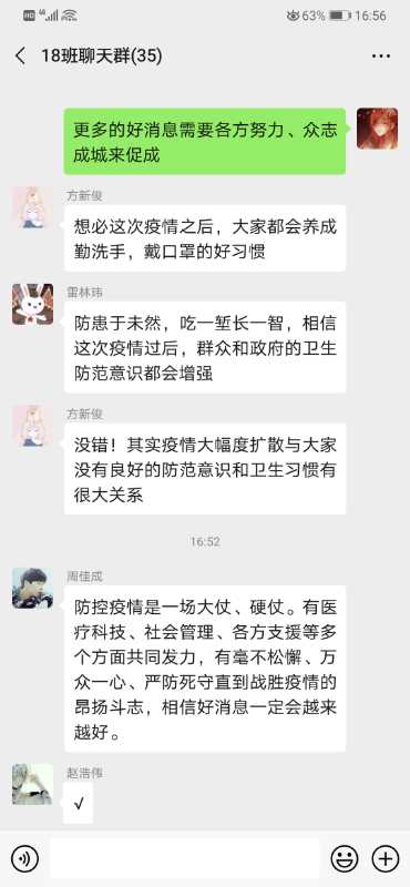 从这场思政大课中,我们学会了很多。我们知道一代人又一代人的使命,一代人又一代人的担当,在疫情防控中的年轻逆行者就是我们的榜样。作为青年大学生的我们要勇担历史重任,坚定党的领导,深入学习马克思主义理论,我们也相信中国人民一定能够尽快取得抗疫斗争的胜利!