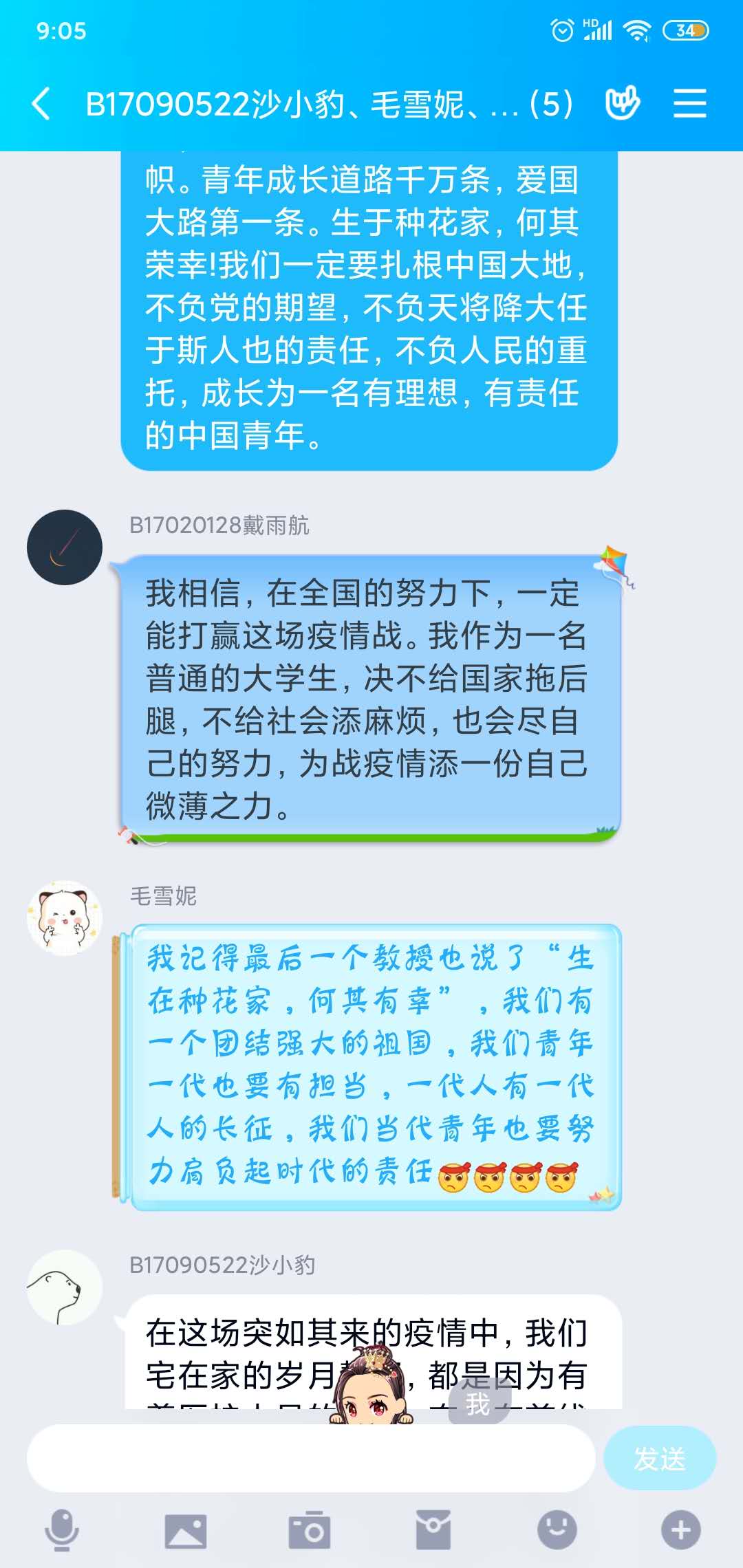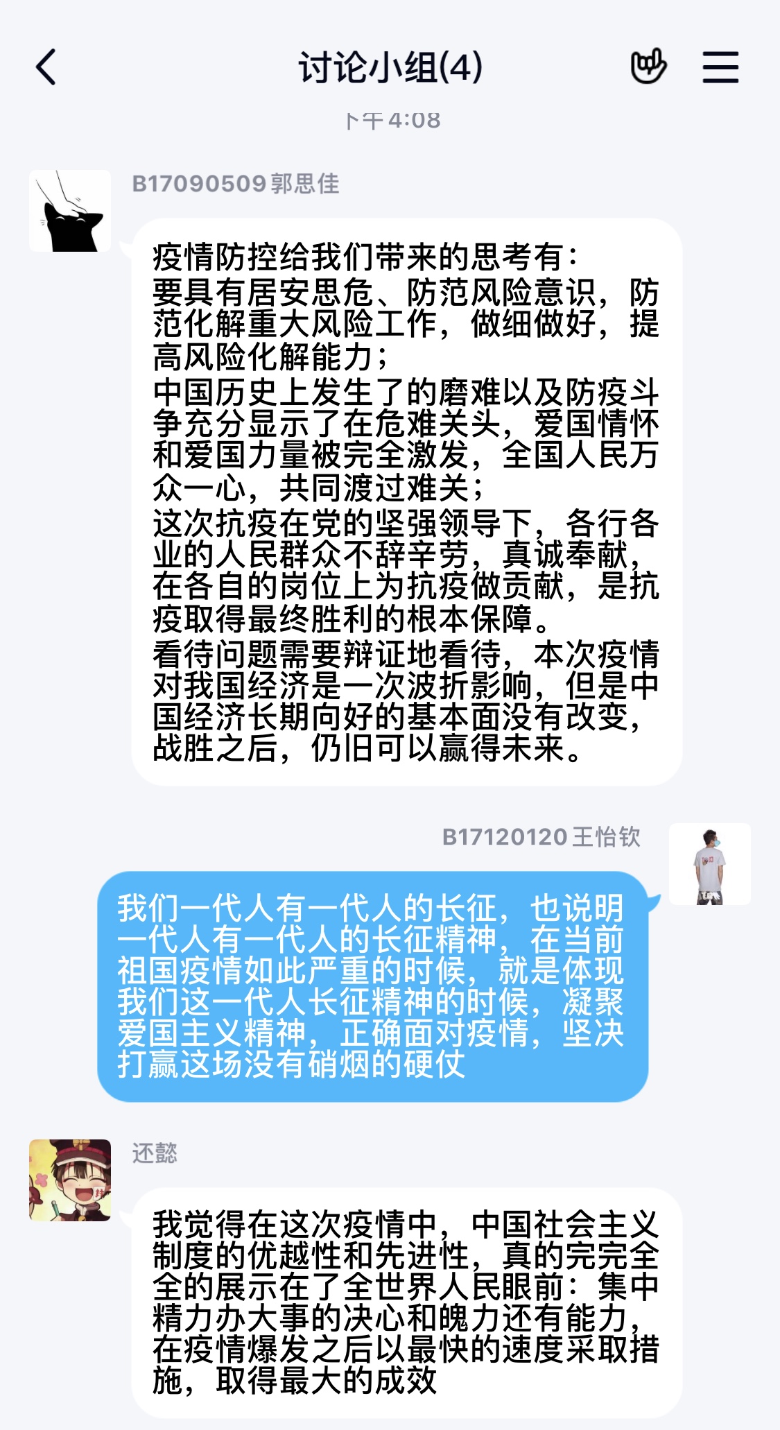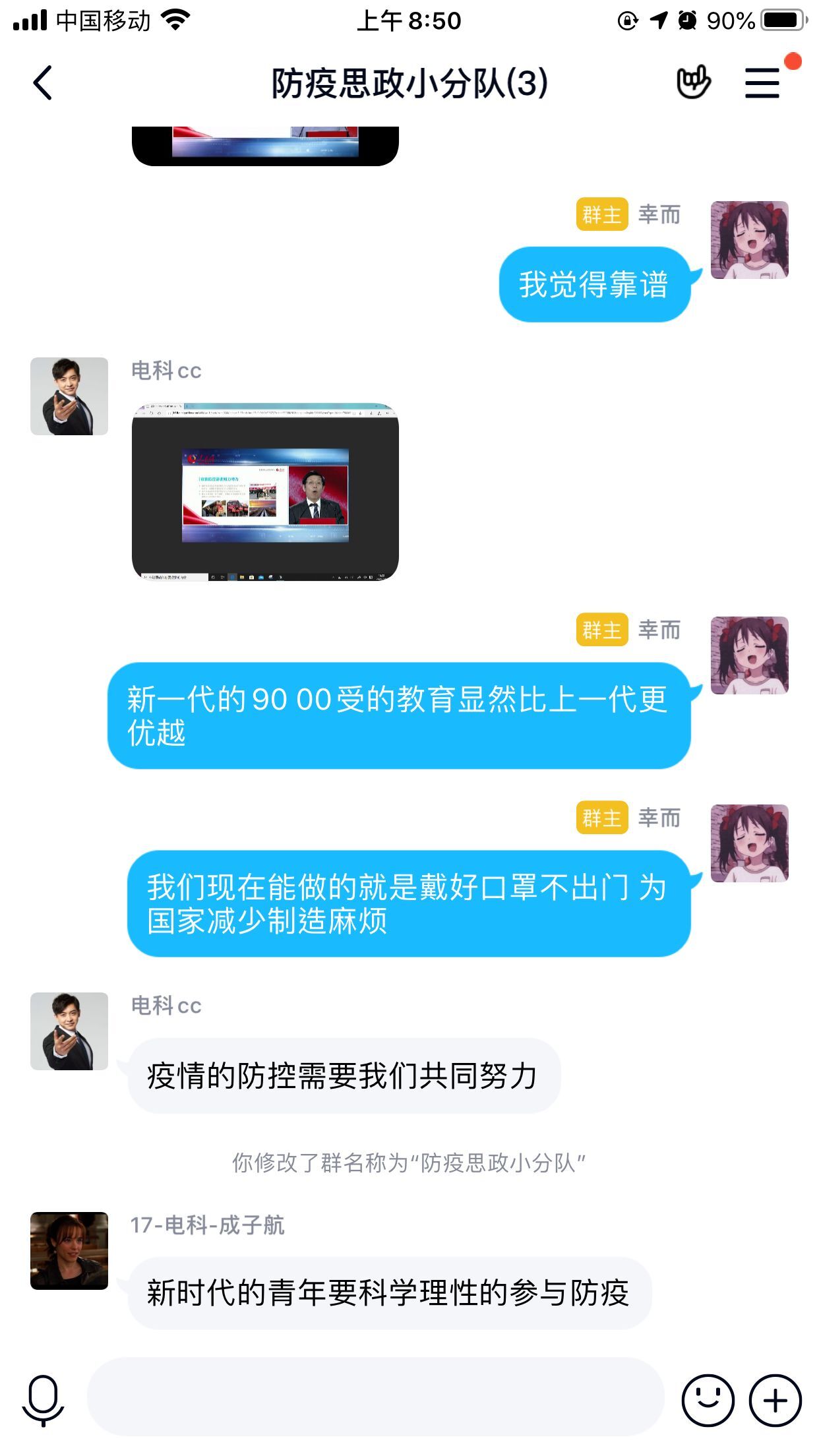 2020年3月9日14点30分,电子与光学工程学院、微电子学院2017级电科、电磁场、微电子专业与全国大学生一起,共同聆听了一堂特殊的网课——“疫情防控思政大课”,大家感触颇深,受益匪浅。艾四林教授让我们深化了理论认识;秦宣教授使我们明白了中国共产党的领导是中国特色社会主义制度的最大优势;在王炳林教授的课中,我们知道了中国历史上的磨难与防疫斗争,增强了必胜信心;冯秀军教授让我们知道了最美的“90 00”后。我们每个人都在这场没有硝烟的战争中起到关键作用,相信有了我们大家的努力,一定会打赢这场疫情攻坚战!向每一位为这场疫情付出的人员致敬!