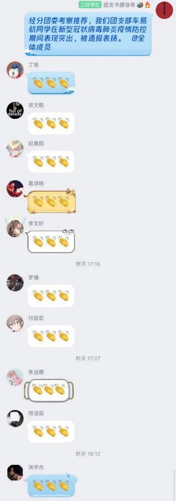 在新型冠状病毒肺炎肆虐之际,现代邮政学院2017级学子丁奕炜、车易航投身于战“疫”一线,进行志愿服务工作,充分发扬了邮政青年勇于担当,无私奉献的精神,绽放出青春之光彩,让鲜红的团旗在疫情防控一线飘扬。与此同时,2017级团总支及时通过QQ,公众号等媒体开展线上宣传教育,倡导同学们为他们点赞,以他们为榜样,向他们学习,鼓励同学们也用自己的实际行动传递青春正能量,与祖国同舟共济,共渡难关!