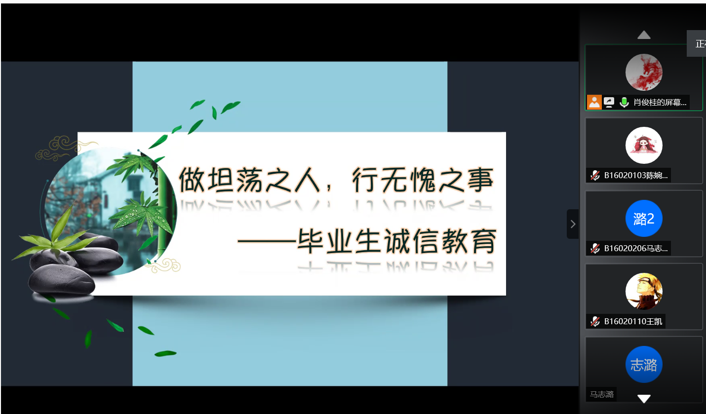 不信不立,不诚不行。为保证每位毕业学子顺利踏上新征程,电子与光学工程学院、微电子学院电科、电磁、微电专业2016级辅导员肖俊桂老师于6月15日晚上在线上召开了“做坦荡之人,行无愧之事”毕业生诚信教育年级大会。