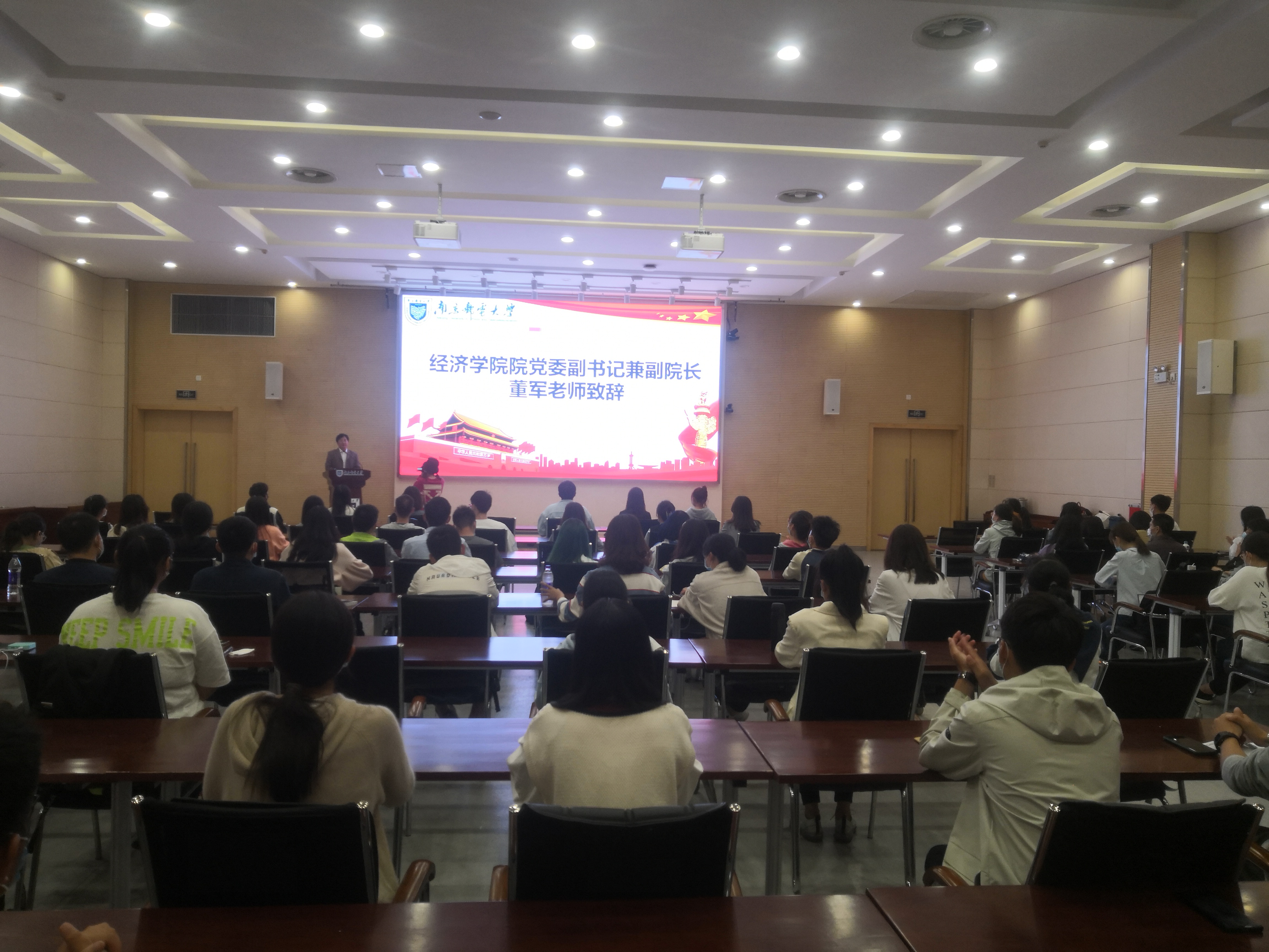 2020年10月14日18:30,南京邮电大学经济学院第一次学生代表大会在仙林校区学科楼报告厅举行。经济学院党委副书记兼副院长董军老师应邀参加了大会。本次大会由经济学院分团委书记王欢老师主持。