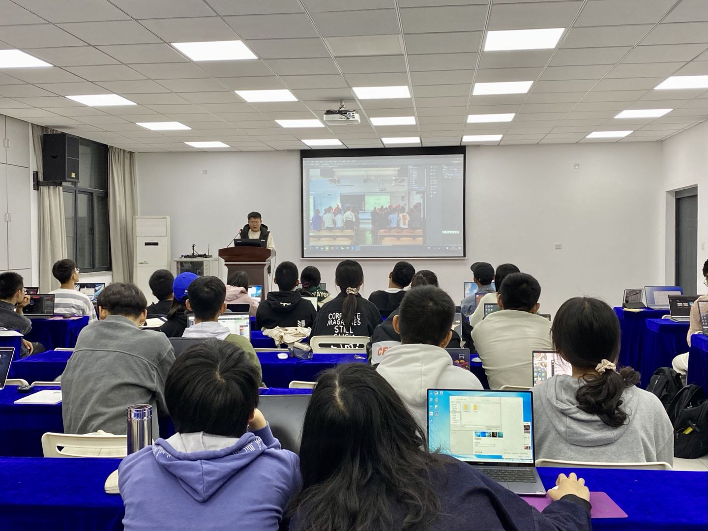 辅导员王祉茗分别从新闻稿、策划书的规范化撰写、图片处理、视频剪辑以及公众号推文的基本制作等方面进行了教学培训。借助PS、PR、AE、AU四款软件介绍图片的简单处理方法以及视频的剪辑技巧,针对PS中十种常用工具的使用进行了指导与演示,并就镜头处理、画面音频分离、视频导出深入解读。同时,为了增强同学们学习新媒体技术的热情,辅导员王祉茗通过以往制作的各类视频使同学们在了解到新媒体技术的同时使整个会场充满欢笑,把会议的欢乐气氛推到高潮。