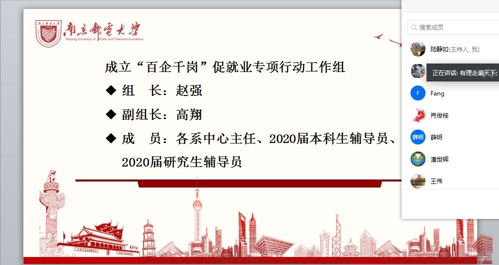 为切实贯彻落实习近平总书记在统筹推进新冠肺炎疫情防控和经济社会发展工作部署会议上的重要讲话精神,根据校招生就业处《关于开展2020届毕业生“百企千岗”促就业专项行动的通知》,结合当前就业形势和我院2020届毕业生实际就业情况,2020年11月10日下午,电子与光学工程学院、微电子学院在电光学科楼A328召开“百企千岗”促就业专项行动部署会议,学院就业创业工作领导小组成员以线上线下两种形式出席会议,会议由赵强院长主持。