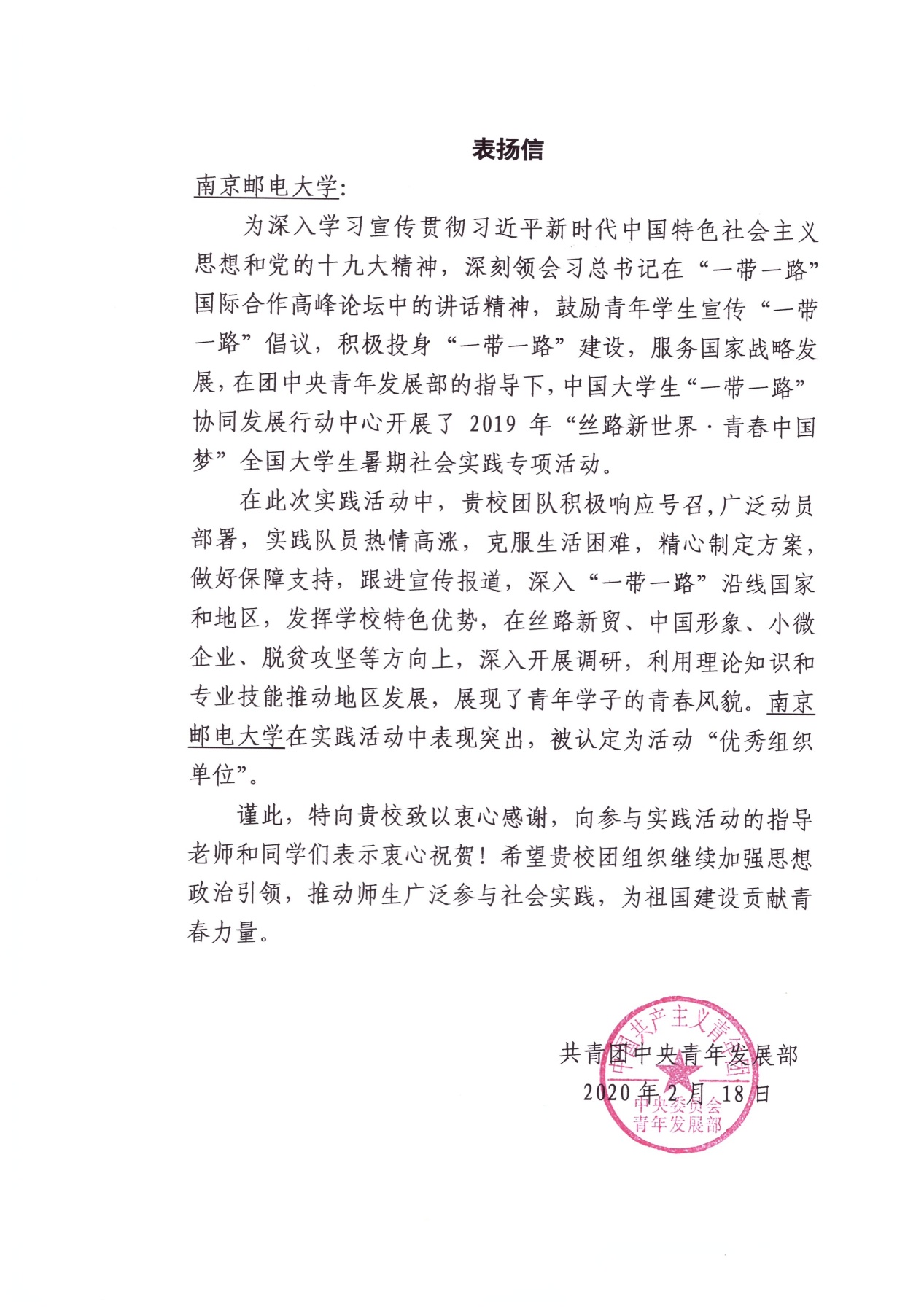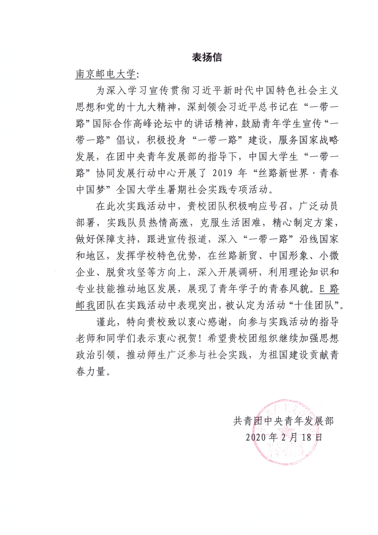 为深入学习宣传贯彻习近平新时代中国特色社会主义思想和党的十九大精神,深刻领会习近平总书记在“一带一路”国际合作高峰论坛中的讲话精神,鼓励青年学生宣传“一带一路”倡议,积极投身“一带一路”建设,服务国家战略发展,在团中央青年发展部的指导下,中国大学生“一带一路”协同发展行动中心开展了2019年“丝路新世界·青春中国梦”全国大学生暑期社会实践专项活动。海外教育学院党委高度重视,学院分团委精心指导,中外学子联合组队“E路邮我”实践团,荣获“丝路新世界·青春中国梦”2019 年全国大学生“一带一路”暑期社会实践专项行动“十佳团队”,学校荣获“优秀组织奖”。