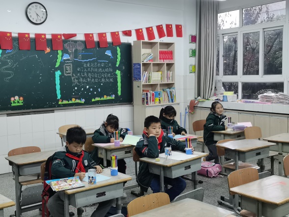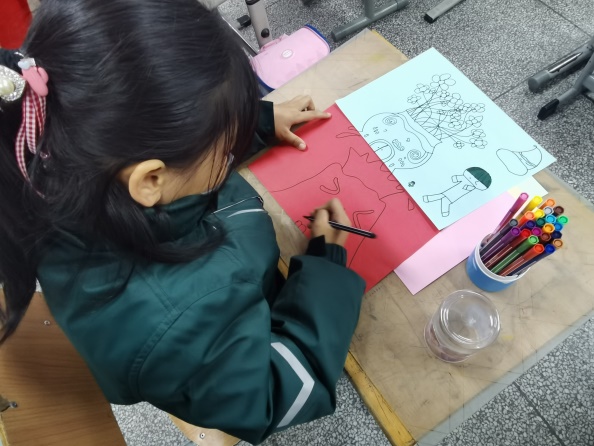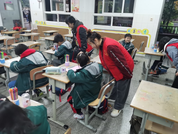刚进教室,志愿者们就感受到了小朋友们的热情,下雨天的寒冷一扫而空。志愿者们先将提前准备好的彩纸和水彩笔等绘画工具发放给小朋友,准备工作结束之后,一位志愿者开始在黑板上做起了范画,还时不时的会和小朋友们互动,鼓励他们发挥自己的想象力,可以进行各种奇思妙想。