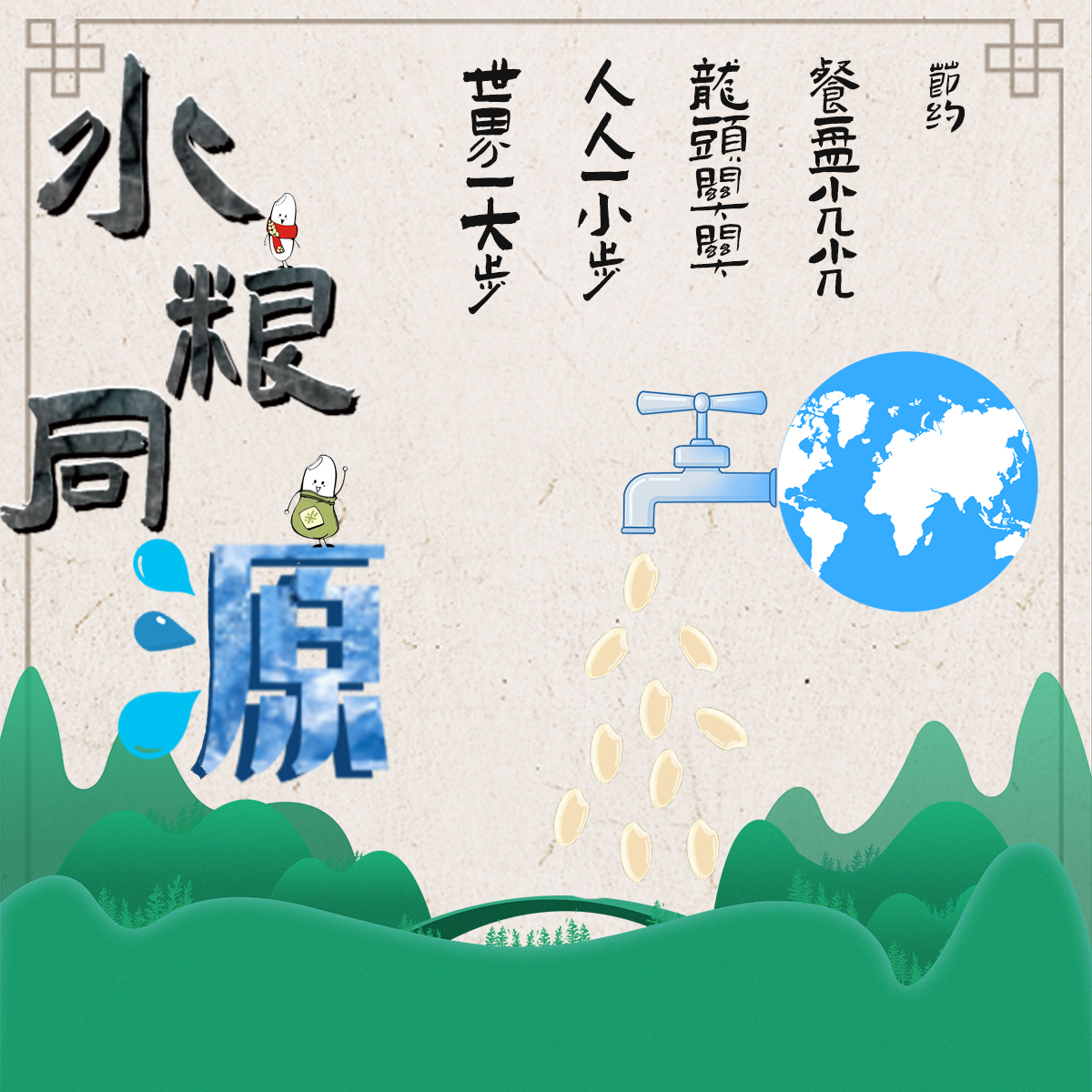 右方的地球既代表了我们生存的地球,也象征一个餐盘。与之相连接的水龙头流出的米粒是流水的化形。流水落下为世界增添了绿色。地球上的水资源滋养了庄稼,粮食又哺育了人类,节约粮食的最终目的就是为了让地球更加美好。左方是作品的名字水粮同源,融入了米的拟人化及水滴等元素,说明了节约水和粮食的重要性。上方是四句号召:餐盘光光,龙头关关,人人一小步,世界一大步。