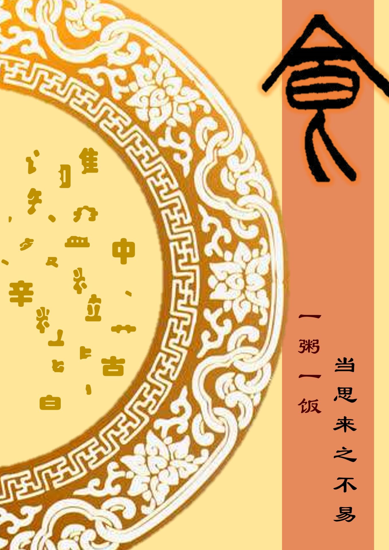 海报《粒粒皆辛苦》主要分左右两部分组成。左半边是半个盘子,盘子里边是将“谁知盘中餐,粒粒皆辛苦” 这句诗拆解为各个部分作为餐盘中的粮食,隐含着警示大家要节约每一粒粮食。右半边用汉字“一粥一饭当思来之不易”直观地警示大家珍惜农民伯伯的劳动成果。“一粥一饭,当思来之不易;半丝半缕,恒念物力维艰”。海报发扬了传承美德,勤俭节约的观念。推动人们积极传承中华民族勤俭节约的优秀传统,牢固树立勤俭节约光荣、铺张浪费可耻的意识,大力弘扬艰苦奋斗的精神,积极倡导文明用餐的新理念、新习惯、新风尚。我们要争做“节约粮食、拒绝浪费”的践行者、宣传者、推动者!节约每一粒粮食。