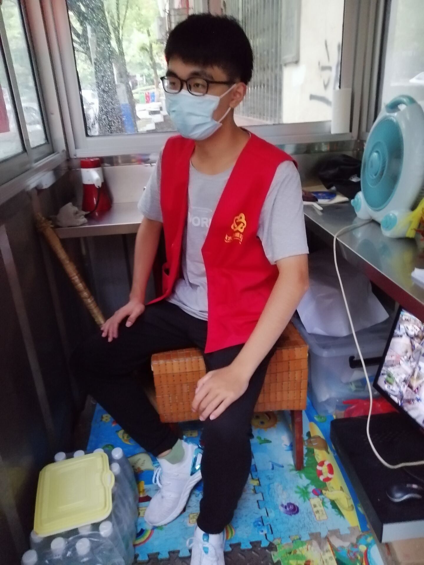 (简永波同学监督小区进出人员戴口罩、扫码)