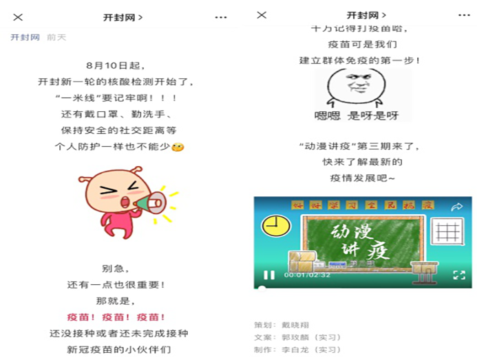 2020级生物医学工程专业的郭玫麟同学,进入家乡的新媒体开封网实习,负责防疫宣传专栏节目“动漫讲疫”的文案撰写和后期配音工作。她通过节目向大家普及疫情防控的硬核知识;同时聚焦群众的真实生活,答疑解惑他们共同关心的问题,及时向疫区和灾区人民送去鼓励。郭玫麟同学说:“每一期节目我都认真选择角度进行科普,媒体人的辛苦,我深切的体会到了,但是甘之如饴。希望通过自己微薄的力量,借助媒体平台,向社会发声。”