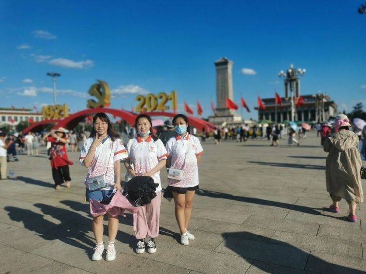 国家博物馆的参观结束后,团队成员来到了天安门广场。站在天安门广场上,仍然能感受到7月1日庆祝中国共产党成立100周年大会的热烈气氛——碧蓝的天空、高高飘扬的红旗、建党百年的标志性建筑展现在眼前,让团队成员心潮澎湃,禁不住抒发对党的热爱和祝福。