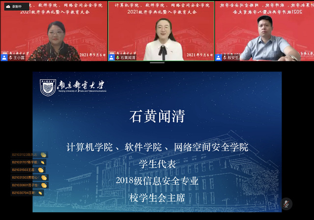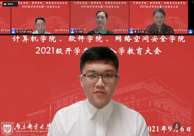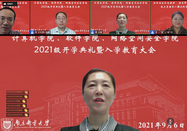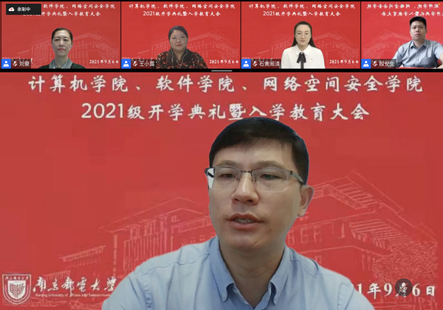 2021年9月6日上午,计算机学院、软件学院、网络空间安全学院隆重召开2021级本科新生线上开学典礼。我院党委书记刘蒙,党委副书记、院长肖甫,副院长张伟、黄海平、陈志,专职纪检员殷安生,教师代表王化群,中心主任代表,2021级新生班主任和新生辅导员们出席本次开学典礼。典礼由党委副书记、副院长王小露主持。