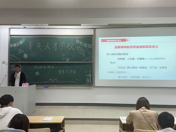 为增强学生对学校的荣誉感与自豪感、引导学生努力成长为符合时代要求的新青年,10月28日晚18:30,电子与光学工程学院、微电子学院第107、108期菁英人才学校在教3-300举行第二次授课。本次授课以《战邮书辉煌,青春写华章》为主题,邀请电子与光学工程学院、微电子学院2020级辅导员李孟杨老师担任主讲人,由院分团委秘书处陈雨亭同学主持,两期菁英人才学校全体学员参加。