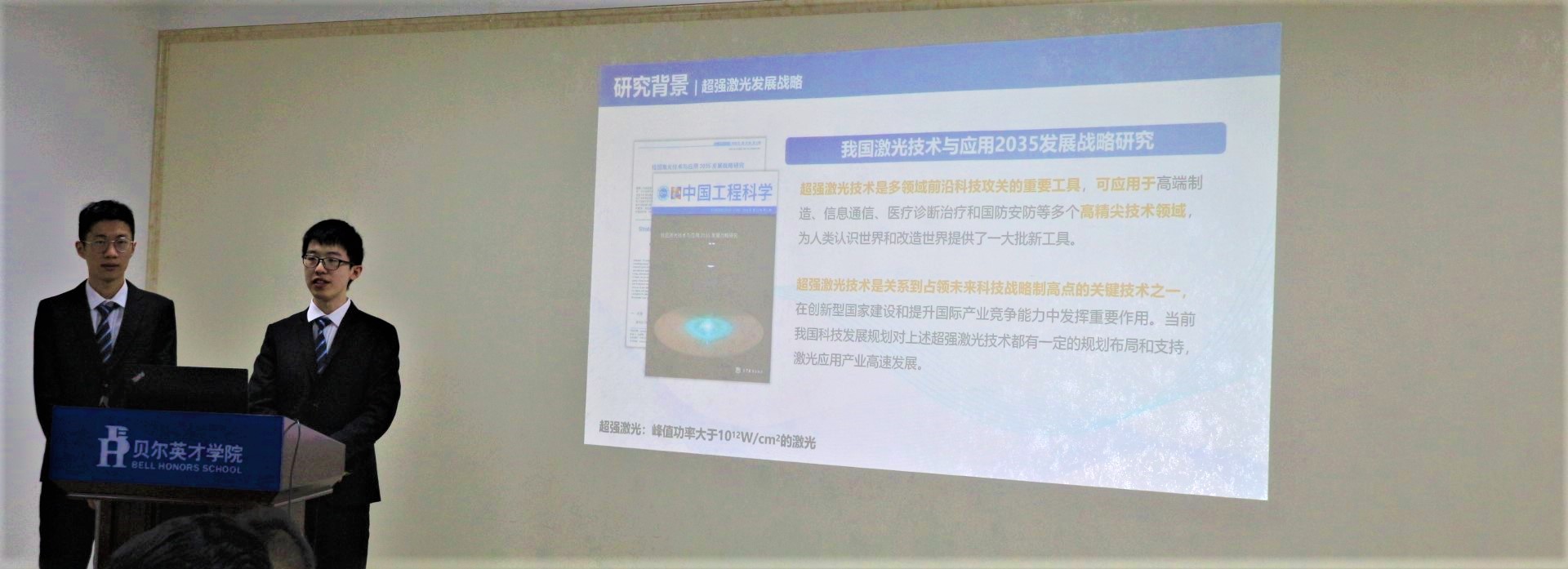 在创新杯院赛正式开始之前,贝尔英才学院院本科生项目团队,对他们的挑战杯项目《电子辐射的特性研究及其在超强激光测量中的应用》,率先进行了答辩展示。他们通过PPT演示向评委老师展示项目背景、研究内容、研究过程及取得的成果,并对评委老师提出问题进行逐一回答。