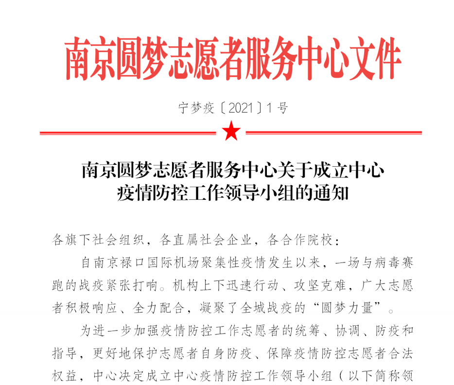 南京圆梦志愿者服务中心关于成立中心疫情防控工作领导小组的通知