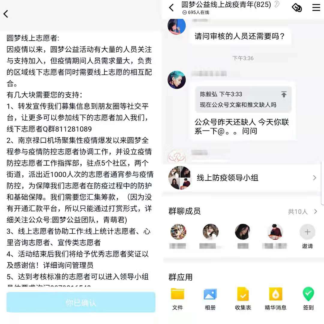 许嘉怡同学积极参与线上志愿服务且宣传成果卓有成效,较为突出,成为南京圆梦志愿者服务中心疫情防控工作领导小组的成员。