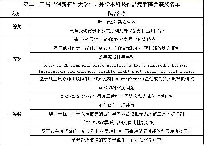 通过答辩评审,“新一代X射线发生器”等2个项目获得院赛一等奖, “基于FPC柔性电路的STEAM教具‘闪念胶囊’”等5项目获得院赛二等奖,“离散物料雪崩问题”等7个项目获得院赛三等奖。