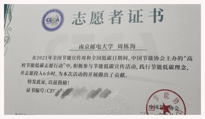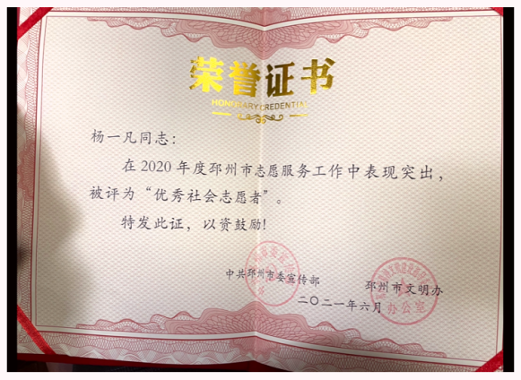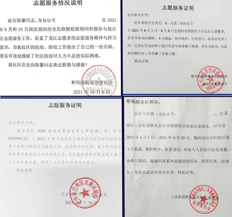19级的研究生张瑞桓在共青团江苏省委社会联络部进行为期一年的志愿服务,配合领导管理省内“苏北计划”相关工作,为省内支教计划贡献自己的力量;18级本科生杨一凡年度志愿时长373小时,被评为2020年度“优秀社会志愿者”;18级本科生何燕、20级本科生黄浩晨、21级本科生周栋海等多位同学在支教、赛事服务、志愿讲解等方面表现突出,得到了当地政府、活动举办方的大力表扬。他们展现了青春的蓬勃朝气,展现了现代邮政的青年风貌。