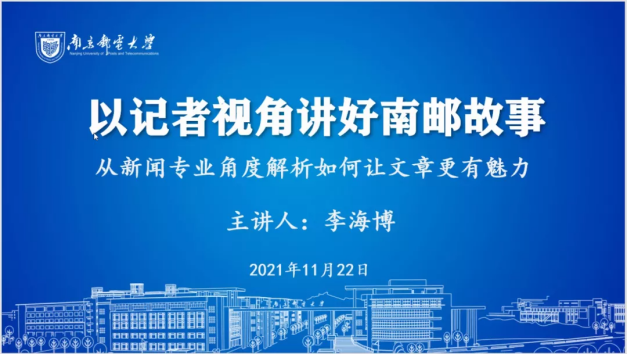 为加强学员文字运用能力和词汇表达能力,培养符合新媒体时代的多功能人才。11月22日,电子与光学工程学院、微电子学院第107、108期菁英人才学校举行第七次授课。根据疫情防控要求,本次授课通过腾讯会议的线上形式展开。本次授课的主题为“以记者视角讲好南邮故事——从新闻专业角度解析如何让文章更有魅力”,邀请南京邮电大学宣传部李海博老师担任主讲人,由学院分团委秘书处李骏葱同学主持,菁英人才学校全体学员参加。