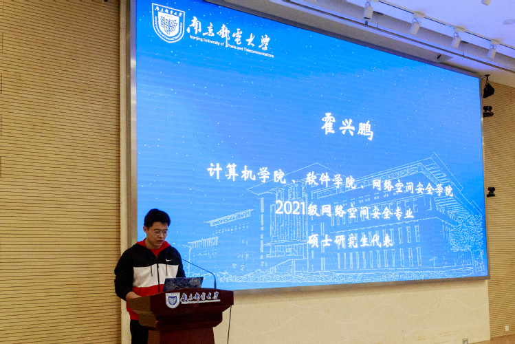 作为2021级新生代表,霍兴鹏同学在发言中提到,在南邮就读的这几年,自己收获满满,也提升良多。他与各位同学分享了自己的成长经历,指出每位同学应首先明白自己为什么要来这里,其次要努力提升自我,培养独立思考的能力。并强调,“青春向党,科技强国”是我们新时代青年应秉承的信念与使命,祝愿各位同学都能在学院继续充实自己,不断在奋斗中提升自我,青春向党,奋斗强国!