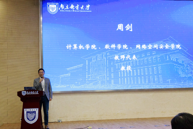 周剑教授代表全体导师发表致辞,他化用食堂标语“腿要勤,腰要弯,嘴要甜”来表明身为导师的责任和担当。同时勉励广大新生,要想“一览众山小”必须学会“会当凌绝顶”,一行代码一行代码地写,一篇论文一篇论文地看,一步一个脚印地走。脚踏实地才能走地踏实、走地长远。