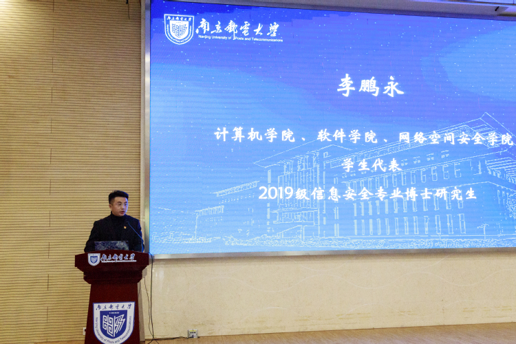 2019级博士研究生李鹏永作为老生代表发言,他指出,在南邮生活的点滴都充满了希望与动力。身为学长,他期望学弟学妹们都能秉承“育才报国守初心,信达天下承使命”这一宗旨与使命,奋发前行。同时,也祝愿各位师弟师妹们在今后学习科研的路上都可以鹏路翱翔,鹏展青春报国之志,每个人都能做到永葆初心,永远燃烧着为党分忧、为国奉献、为民解愁的热望。