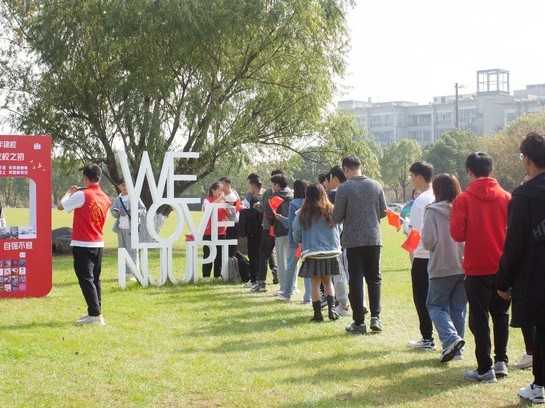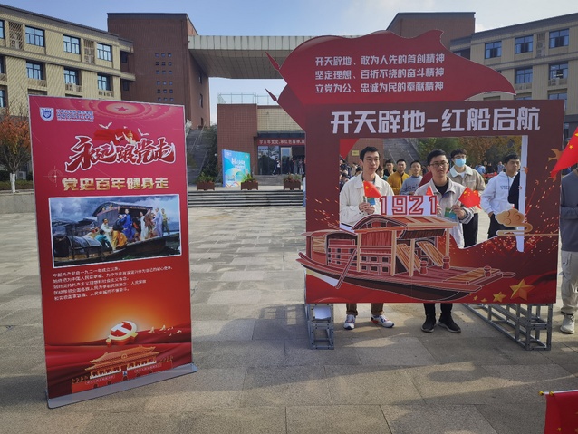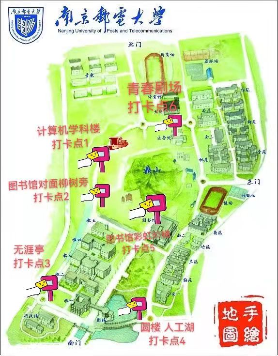 健身走路线从计算机学科楼出发环行校园一周,途经图书馆、无涯亭、圆楼人工湖、图书馆彩虹阶梯和青春剧场六个打卡点,每个打卡点按照党史百年以及南邮红色校史历程中的重要时间节点来设计宣传牌内容。