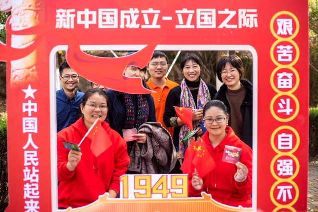 第3个打卡点宣传牌内容为:“1949—新中国成立 立国之际。1949年10月1日,北京30万群众齐集天安门广场,参加隆重的开国大典。毛泽东主席在天安门城楼上向全世界庄严宣告:‘中华人民共和国中央人民政府今天成立了!’中国人民从此‘站起来了’。”