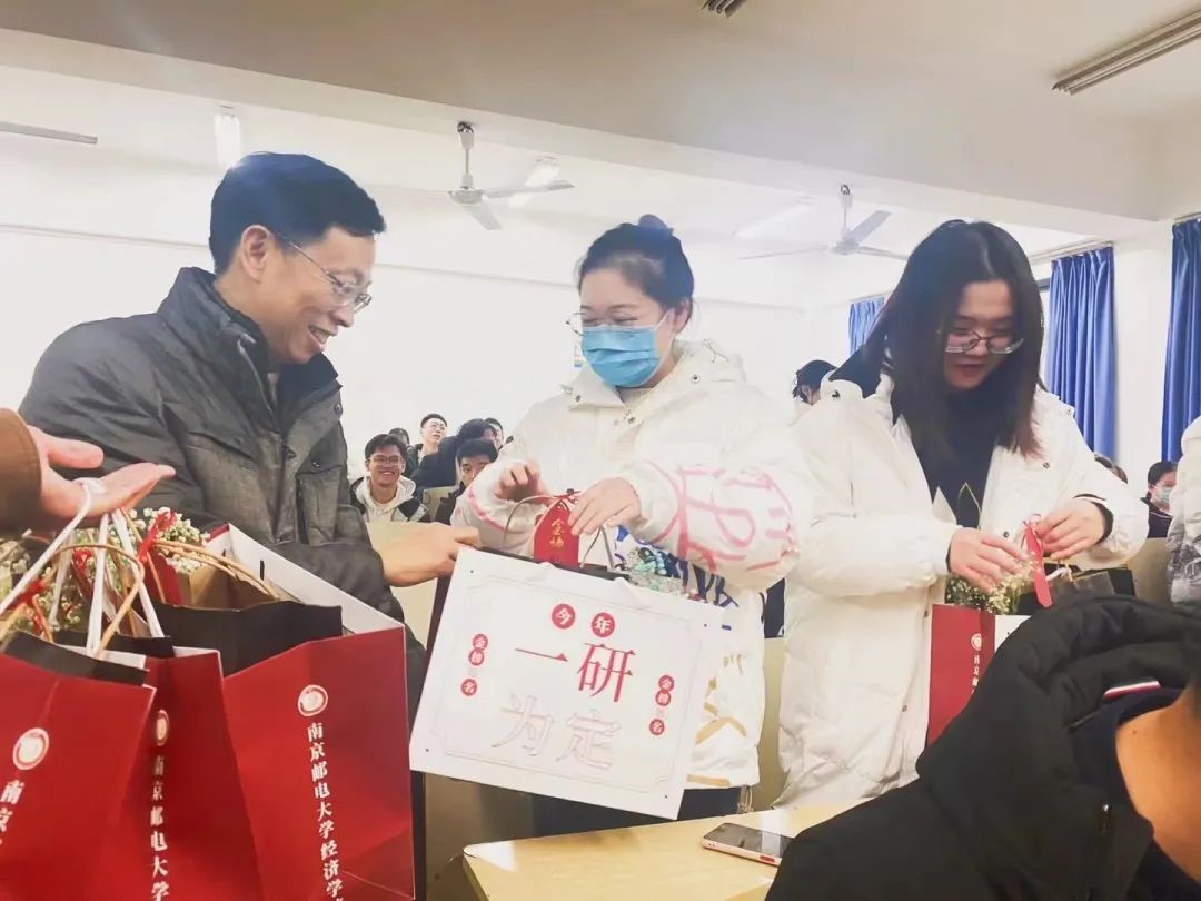 随后,老师们将学院精心准备的慰问礼包亲手发到每一位考研学子手中,传递了学院对于2018级考研学子的祝福与期待。慰问礼包中除了包含补充体力的食物饮品、寓意平安顺遂的苹果、象征祝福的满天星花束,更放有一张来自辅导员王珏亲手书写的祝福卡片。一字一句,表达了辅导员浓浓的关爱与祝福。正如卡片上所写:“星光不负赶路人,付出终将有回报!”愿大家放平心态,稳定发挥,考出期待的好成绩,无愧于自己的付出与努力!
