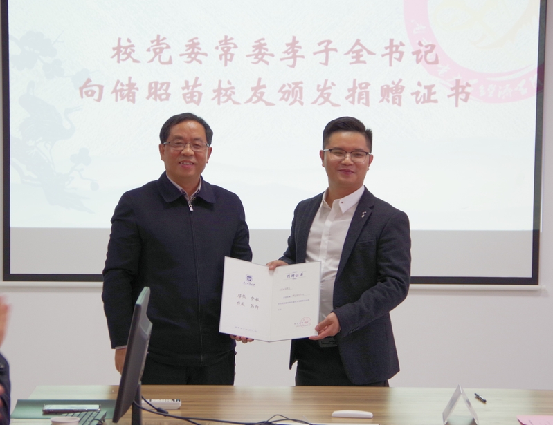 校党委常委、纪委书记李子全向储昭苗校友颁发捐赠证书
