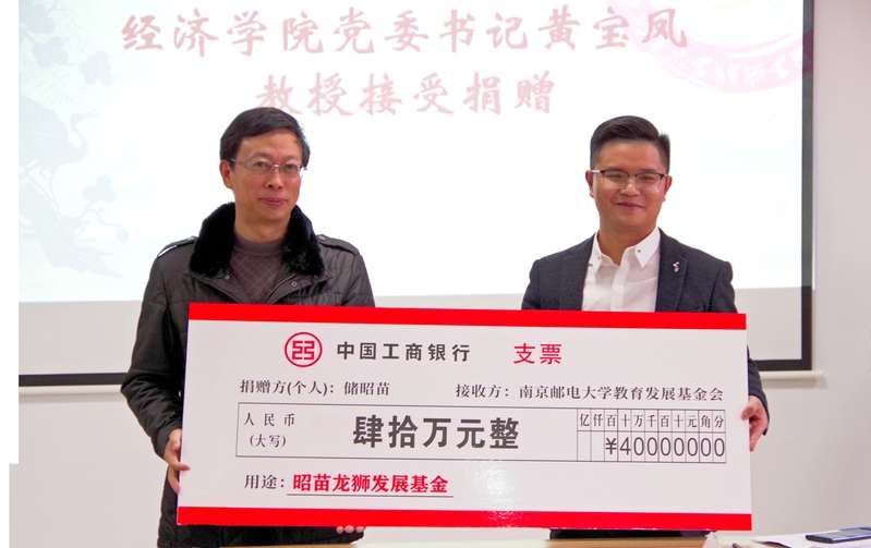 捐赠仪式由经济学院党委副书记、副院长董军主持,仪式上,储昭苗校友、经济学院院长岳中刚共同签署捐赠协议,经济学院党委书记黄宝凤代表学校接受储昭苗校友向学校捐赠的支票,校党委常委、纪委书记、省监委派驻南京邮电大学监察专员李子全教授为储昭苗校友颁发捐赠证书,校团委书记李晓华向储昭苗校友赠送“十冠王”纪念体恤衫和徽章。校龙狮团副团长敬钰蕾同学从思想引领、南邮精神、非遗传承、体育竞技、文化创新、学科竞赛、品牌建设等方面汇报了大学生龙狮团发展的历程。最后与会嘉宾合影留念。