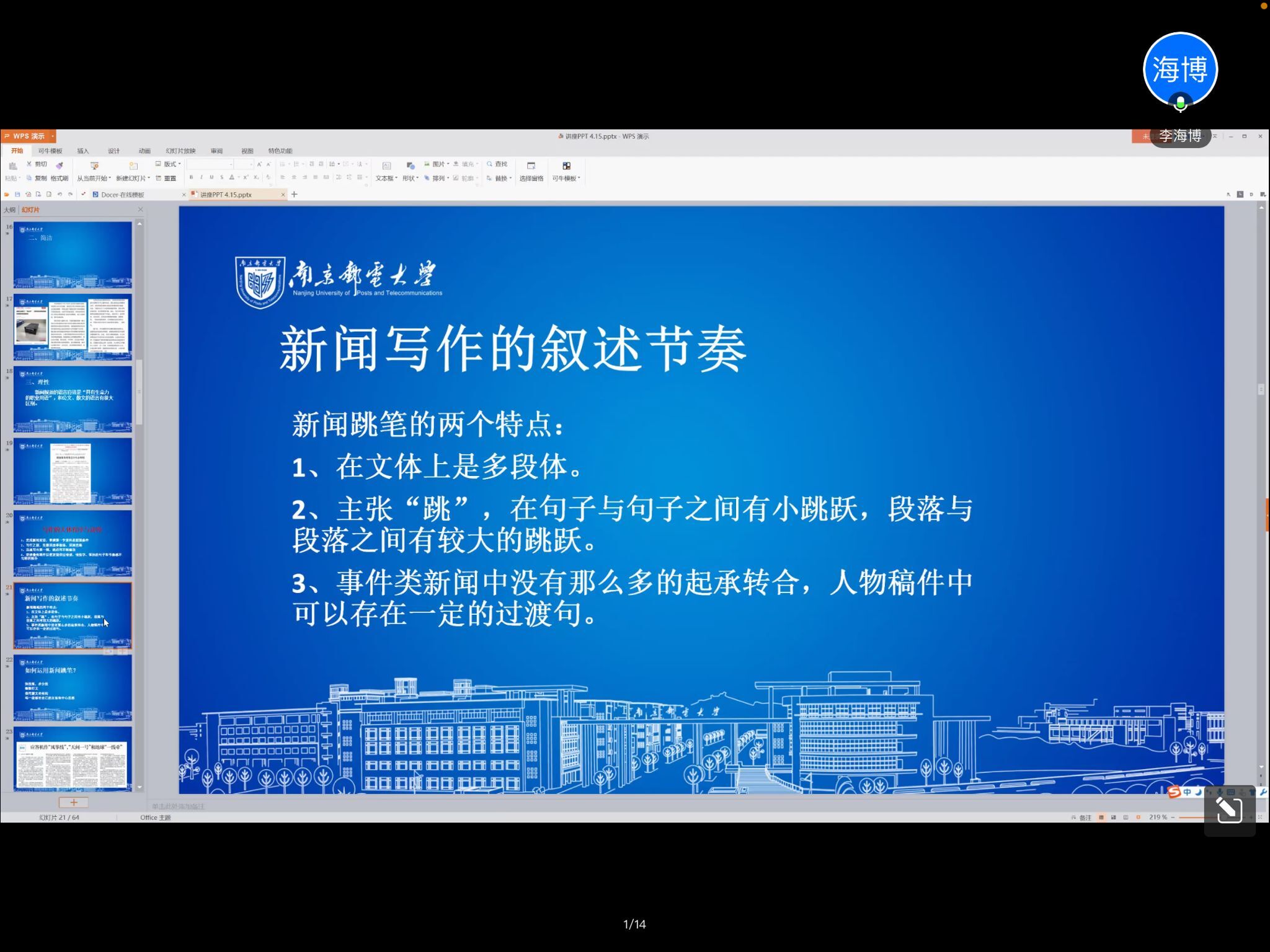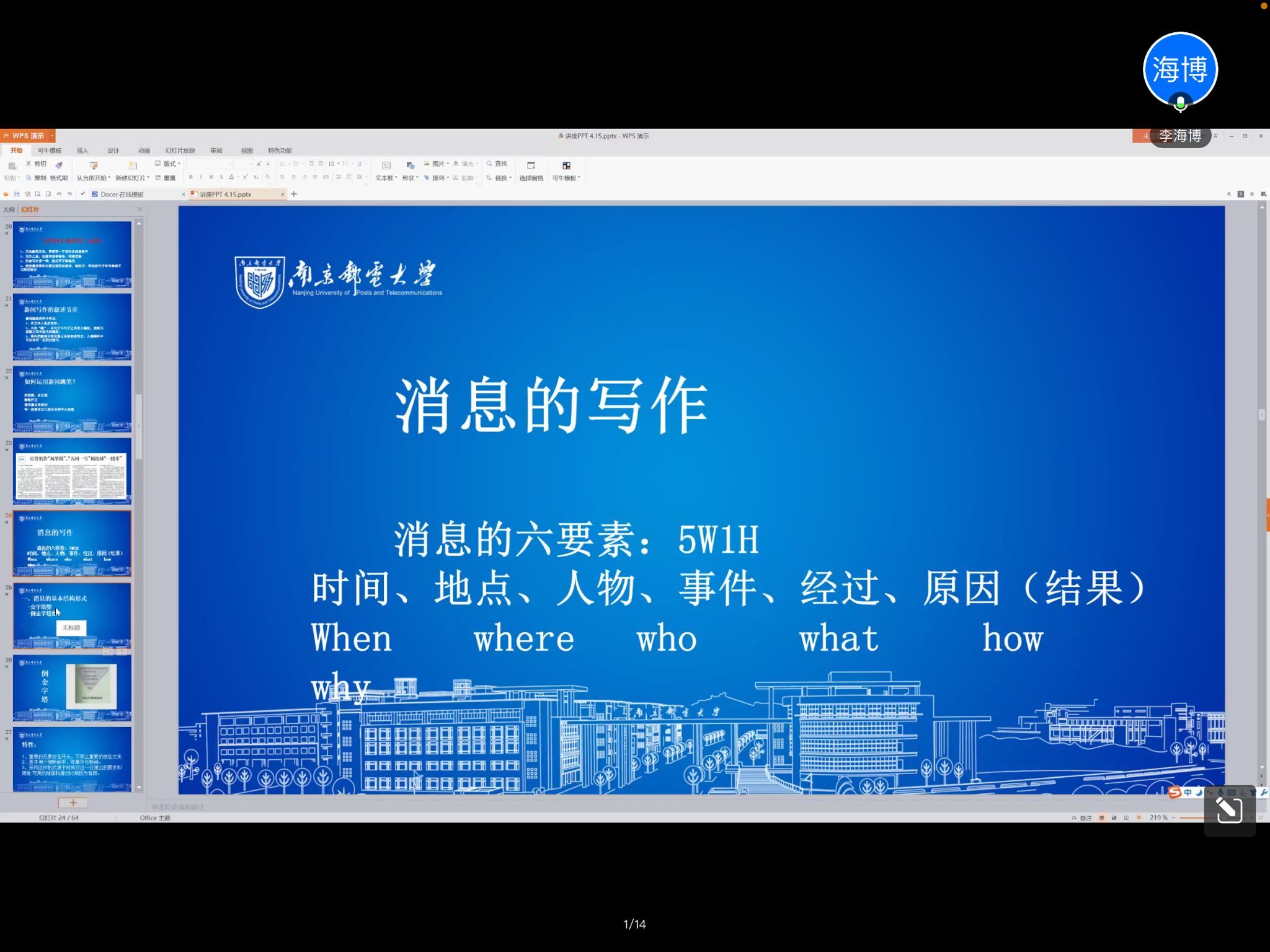 为提高学员撰写文章的能力,坚定走好中国道路,讲好中国故事的信念。4月15日,电子与光学工程学院、柔性电子(未来技术)学院第118、119期菁英人才学校举行第三次授课。根据疫情防控要求,本次会议通过腾讯会议的线上形式展开。本次授课的主题为“以记者视角讲好南邮故事——从新闻专业角度解析如何让文章更有魅力”,邀请南京邮电大学党委宣传部李海博老师担任主讲人,由B21021719何苏苏同学主持,菁英人才学校全体学员参加。