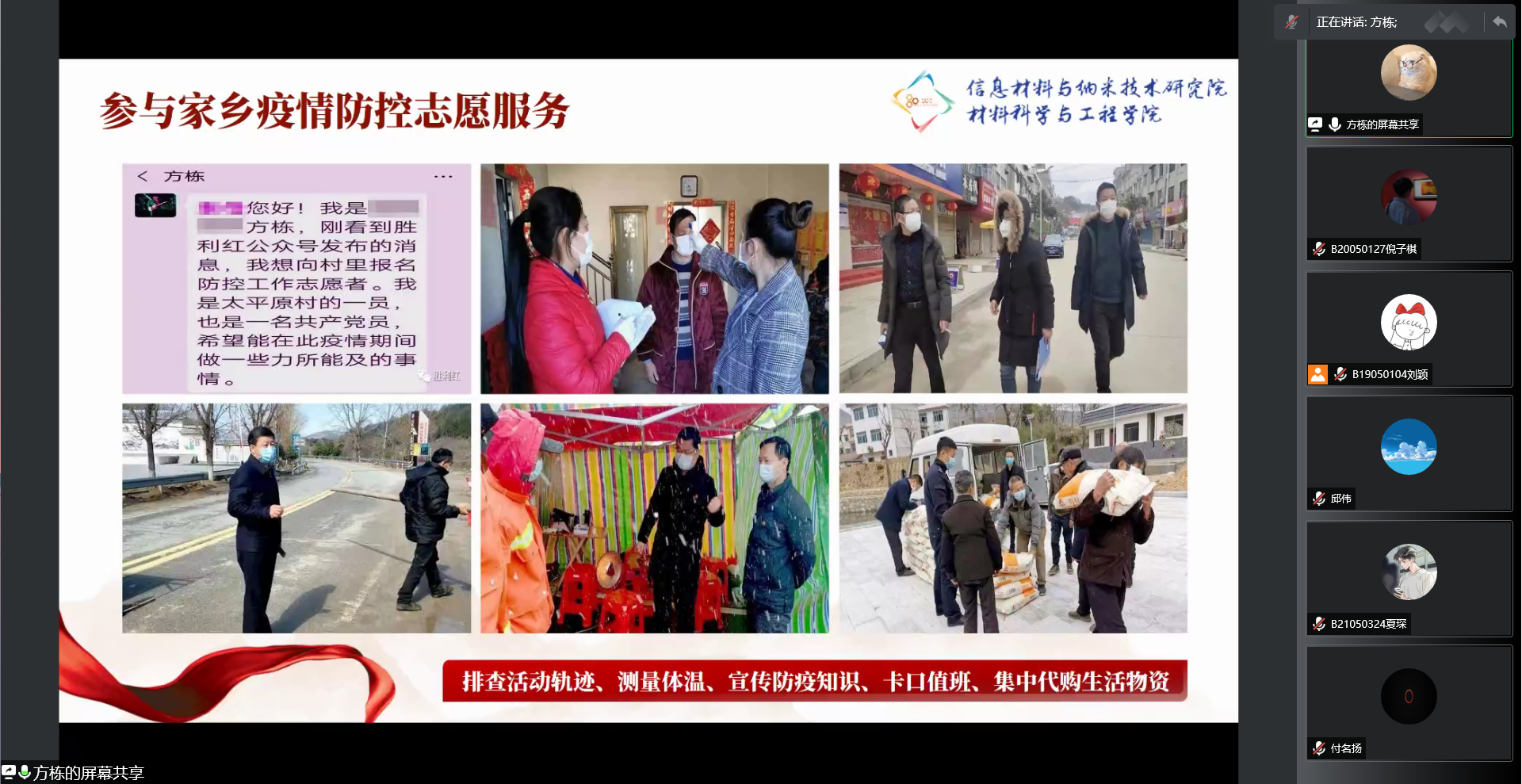 第二个关键词为“初心”。2020年初,新冠疫情席卷而来,方栋同学,奋勇当先,积极响应号召,争当抗疫志愿者。作为抗疫第一线的志愿者、人民的共产党员,不顾自身安危,守护人民,守护国家,他向同学们诠释了一名新时代青年党员的初心--“为天地立心,为生民立命,为往圣继绝学,为万世开太平”。作为党员,他响应了时代号召,肩负起时代责任,为时代建设贡献出自己的一份力量。