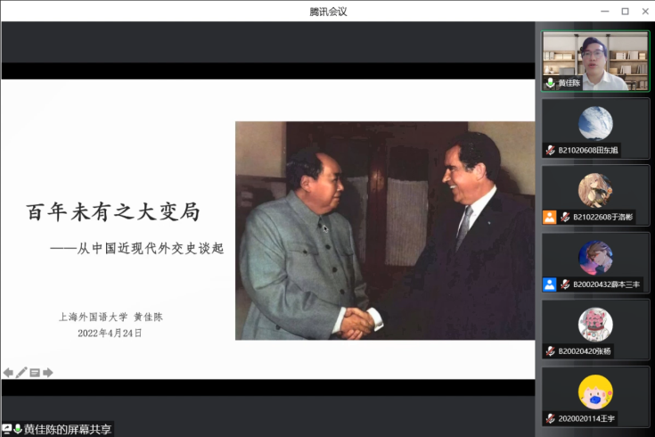 为普及国际关系与外交知识,在同学们心中牢固国家主权意识,培养全面发展的新时代人才,4月24日晚,电子与光学工程学院、柔性电子(未来技术)学院第118、119期菁英人才学校举行第四次授课。本次授课主题为“百年未有之大变局——从中国近现代外交史谈起”。根据疫情防控要求,本次授课以线上授课方式举行,由上海外国语大学国际事务与公共关系学院黄佳陈老师担任主讲人,我院于洛彬同学担任主持。