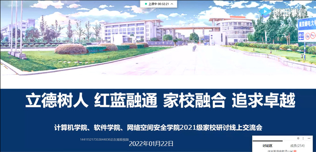 为营造学校与家庭协同育人的良好氛围,使2021级学生家长能全面了解孩子在校的学习情况及行为表现,更透彻地理解孩子所学专业未来的发展前景,2022年1月22日,计算机学院、软件学院、网络空间安全学院组织召开了2021级家校研讨线上交流会暨“言职邮你”专业规划讲座,2021级部分学生家长参加了会议。