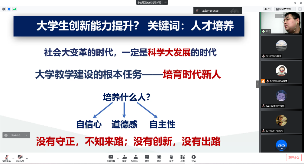 科技创新在中华民族伟大复兴战略全局中肩负着重大历史使命。为使同学们认清科技创新的重要性,培养同学们的创新思维,电子与光学工程学院、柔性电子(未来技术)学院于5月19日举行第118、119期菁英人才学校第七次授课,由我校张珺老师担任主讲人。根据当前疫情防控要求,本次授课在线上展开。菁英人才学校全体学员参与本次授课。