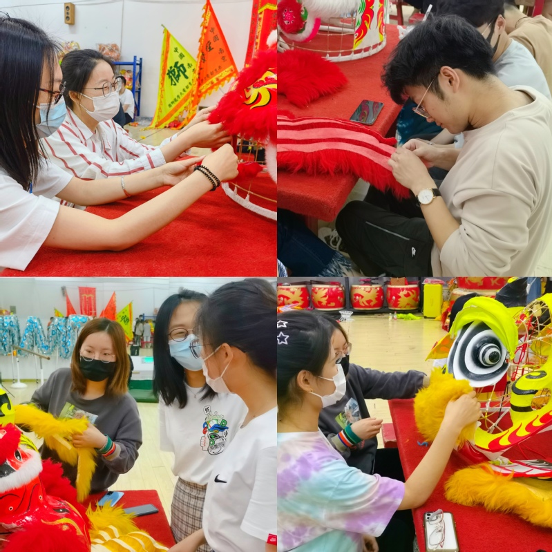 龙狮团负责人王鑫宇同学现场展示了舞狮头内部机关构造,并讲解了舞狮头制作工艺和装饰技巧,研究生纷纷动手体验,全身心投入到手工制作中,为舞狮头装饰各色绒毛,通过集中注意力,让身心放松,感受狮头扎作的深厚底蕴和中国传统文化中的工匠精神。