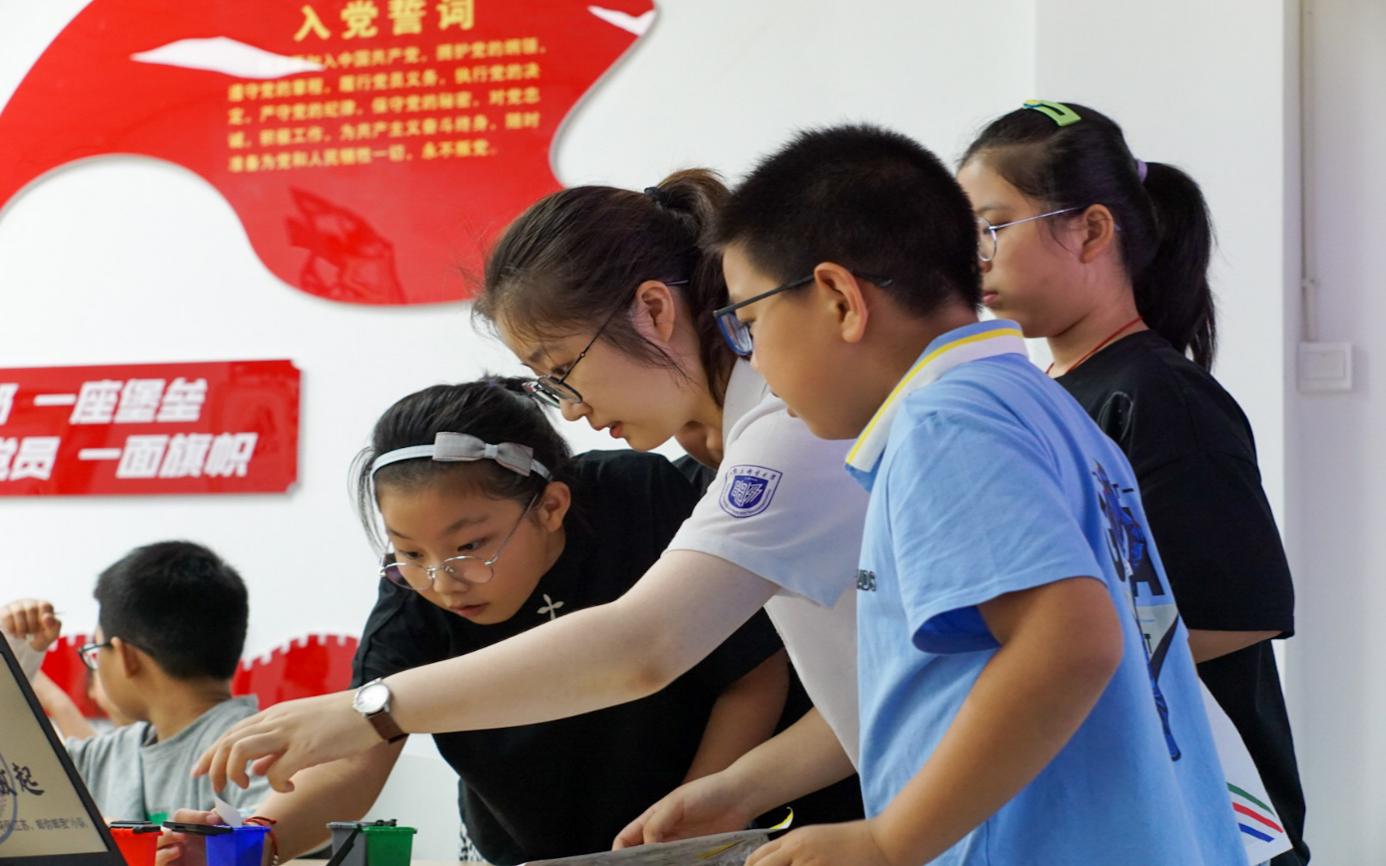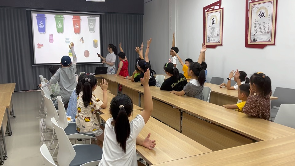 人生的扣子从一开始就要扣好。7月中旬,实践团邀请了南苑小学的同学们参加“垃圾分类”主题讲座,以PPT授课为主,答疑解惑和游戏互动相辅相成,在知识问答的环节,小朋友们积极踊跃举手发言。