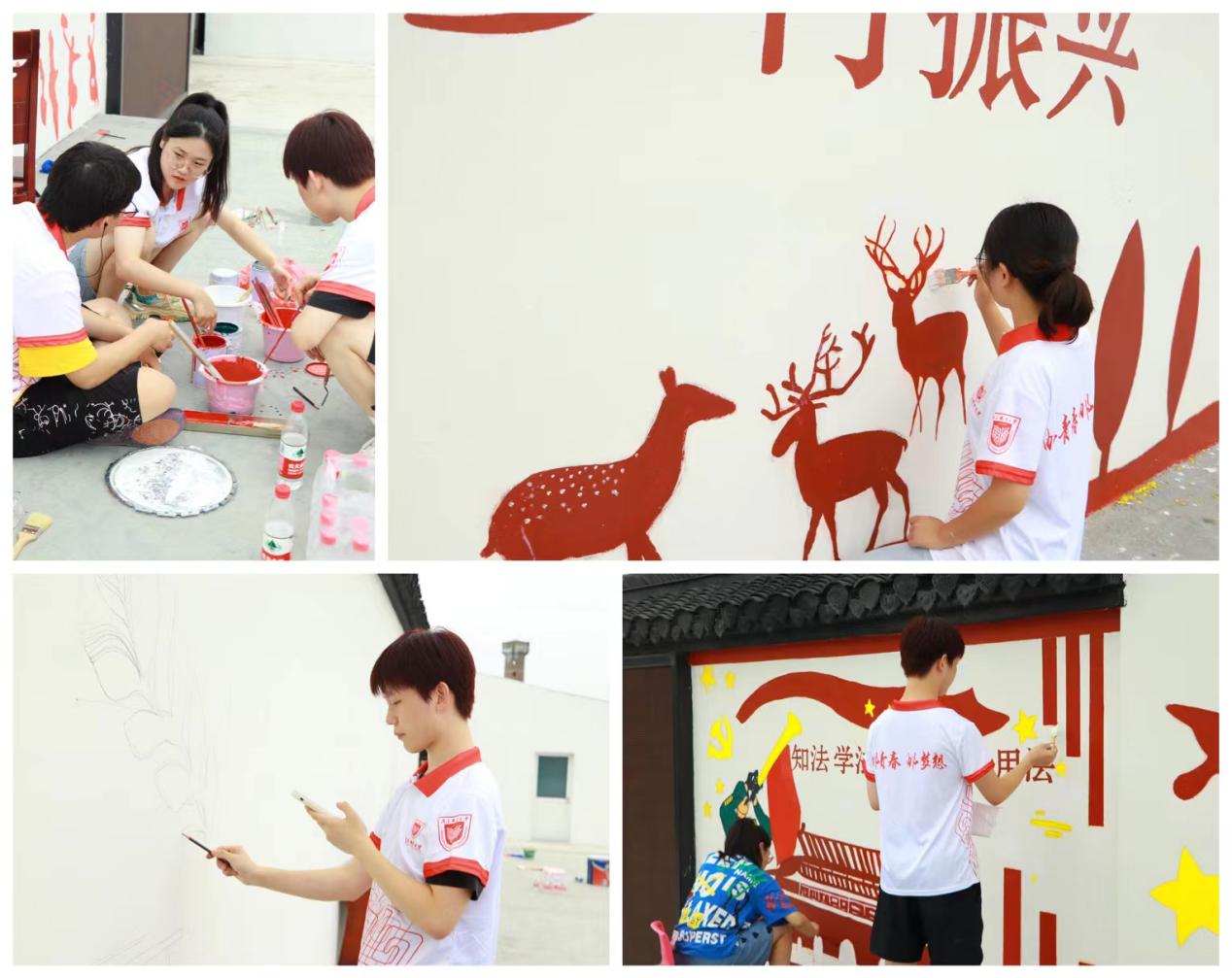 乡村美化组的团员们不惧高温酷暑,日夜赶工。每天早上召开成员碰头会后,他们便奔赴工作现场,有的准备画材、调色,有的构图起形、勾线上色。大家各负其责,团结协作,用智慧和创意精心装点顾陶村文化大舞台。伴随着他们手中笔刷的轻轻涂抹,“硕果丰收、美丽乡村”的形象跃然墙上,原本单一乏味的陈旧白墙顿时有了活力,变身成顾陶村综合服务中心一道靓丽的风景。