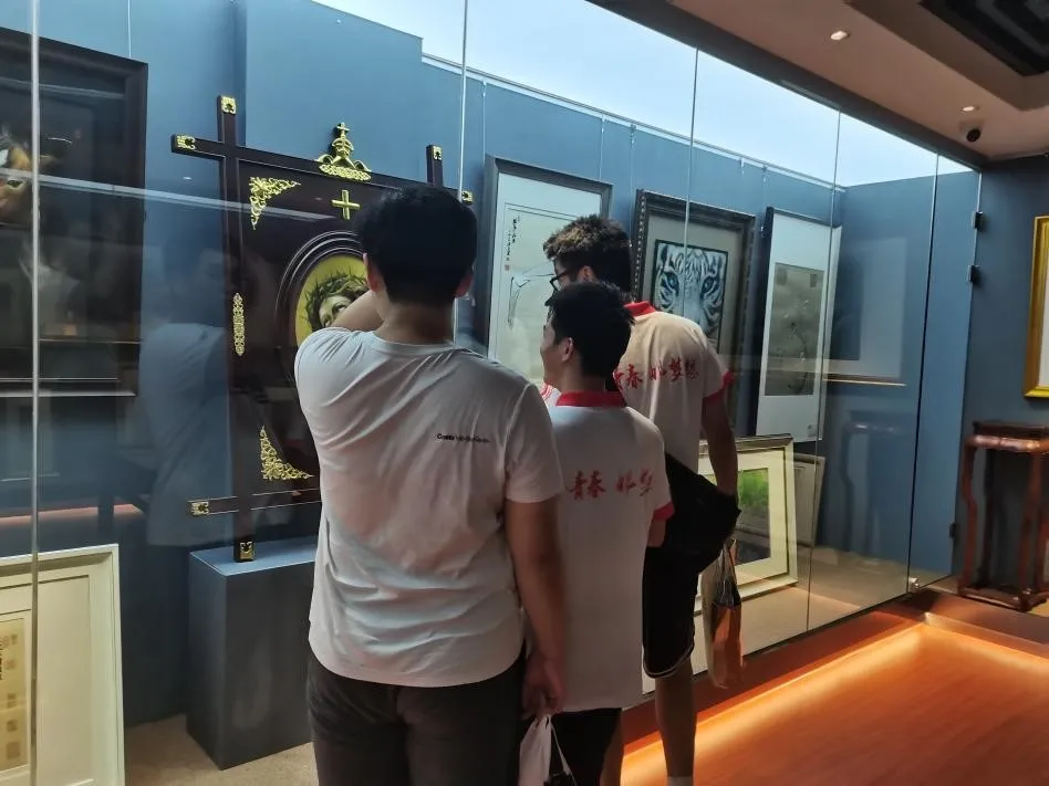 团队走进沈绣,欣赏和品读了一幅幅精美的绣品。这种独特、精致的刺绣技法,所孕育出的每幅绣品都巧夺天工,蕴含着蓬勃的张力与魅力,令人惊叹不已。实践团队深入了解了非遗的深厚文化底蕴和神奇魅力,也感悟了博大精深的工匠技艺和伟大纯粹的匠心精神。