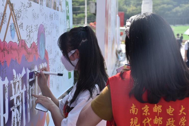 图5为研究生新生在签名墙前留影