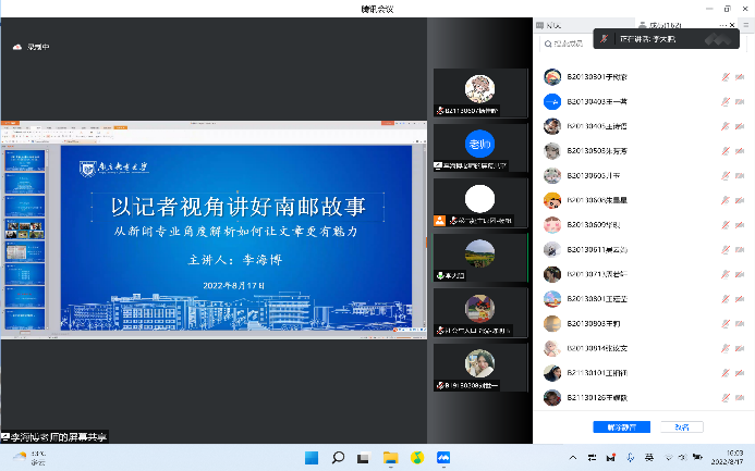 2022年8月17日下午,社会与人口学院第133、134期菁英人才班第五次授课于线上举行。为提高我院学生新闻材料撰写能力以及综合写作能力,此次课程邀请学校党委宣传部李海博老师担任主讲人,菁英班全体成员参加。