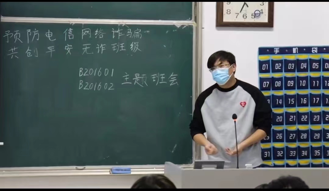 为提高同学们的安全防范意识,增强自我保护能力,进一步维护同学们的自身合法权益,2022年10月24日晚上六点三十,应用技术学院于锁金村教学楼604教室开展了以“预防电信网络诈骗,共创平安防诈班级”为主题的教育班会,本次班会由B201602班袁泽航同学主持,2020级信息工程专业全体同学参加。